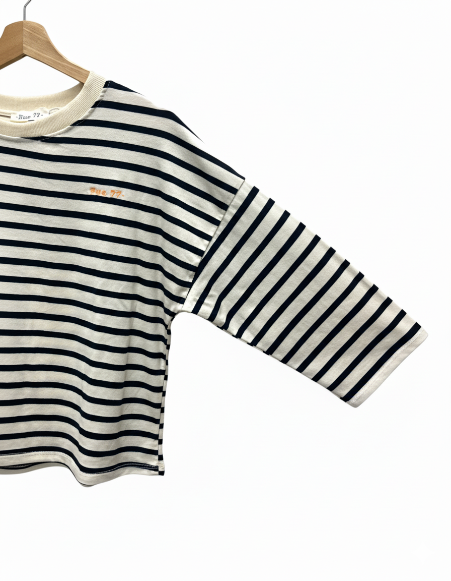 Camiseta de algodón de rayas azul oscuro. Lleva el logo de Rue 77 bordado en naranja flúor.