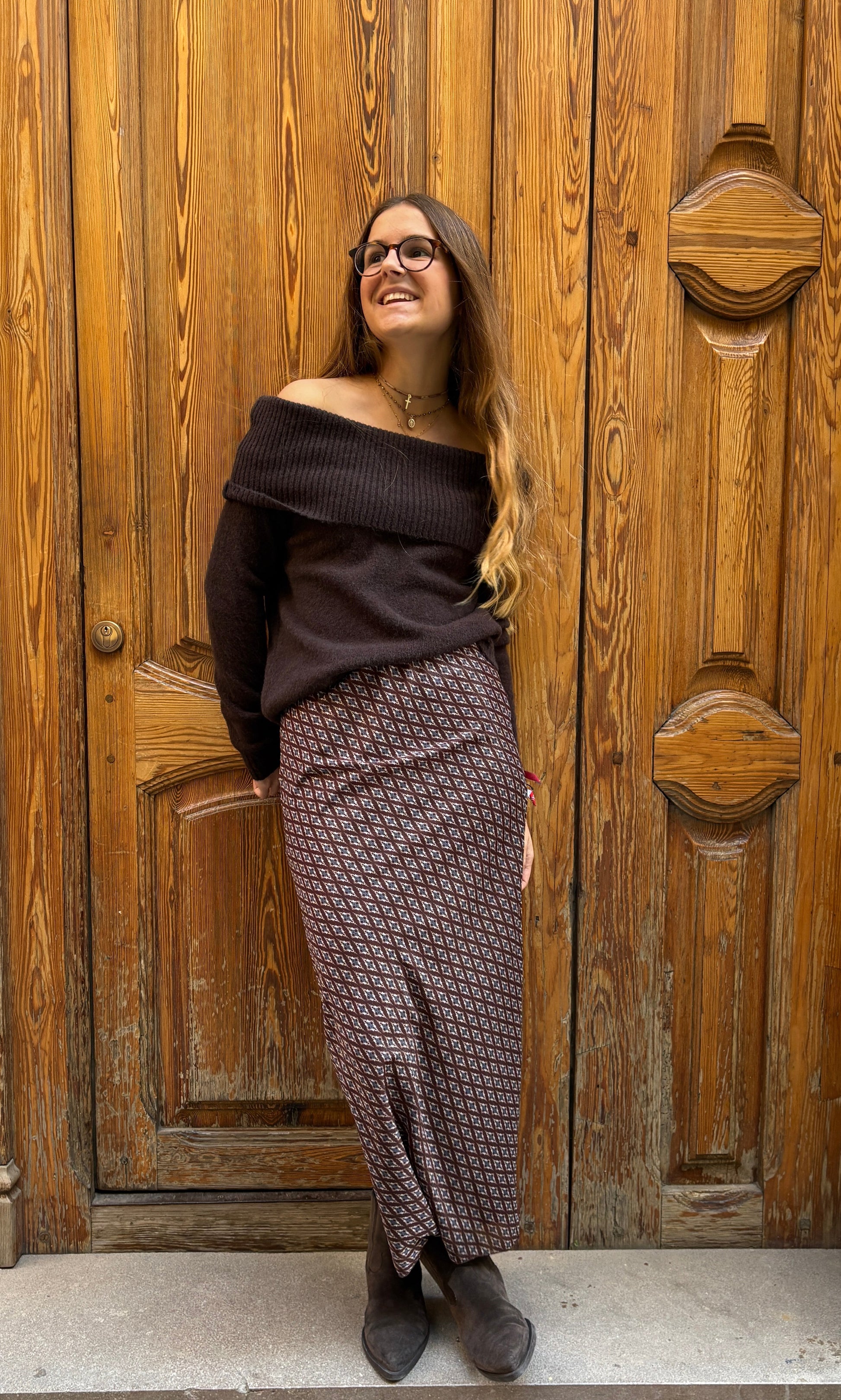 Falda de gasa larga en estampado en tonos marrón. El estampado exacto se muestra en la imagen 2.
