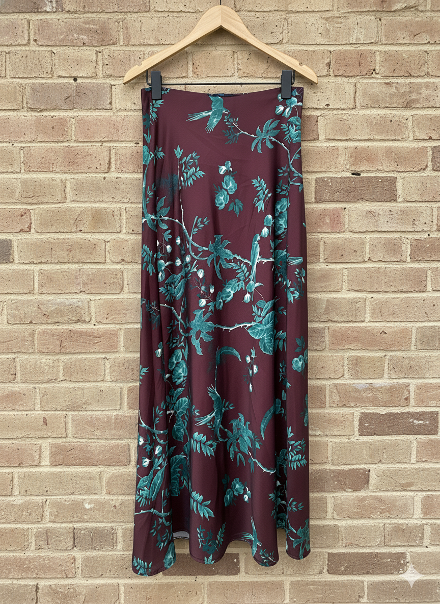 Falda de raso con estampado de flores y pájaros. En 3 tonos