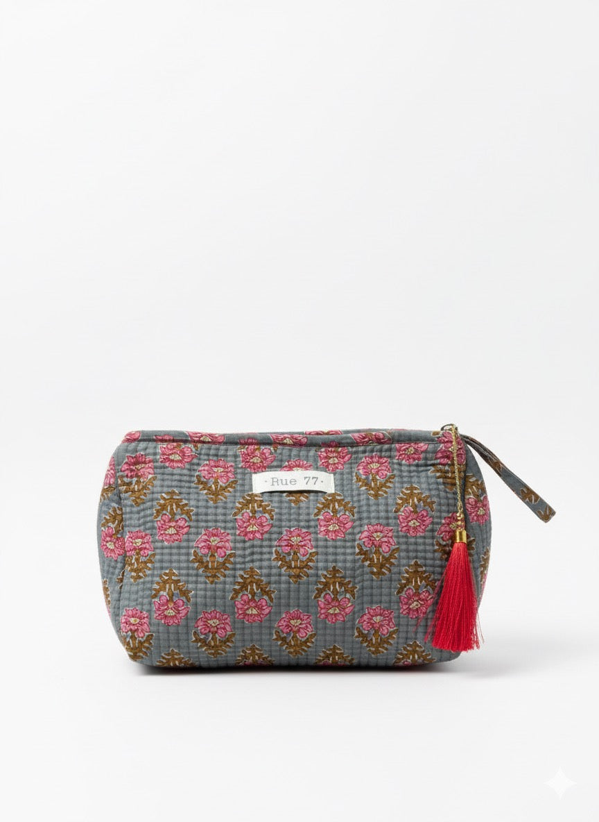 Neceser de algodón estampado en block print de la India. Plastificado en su interior.