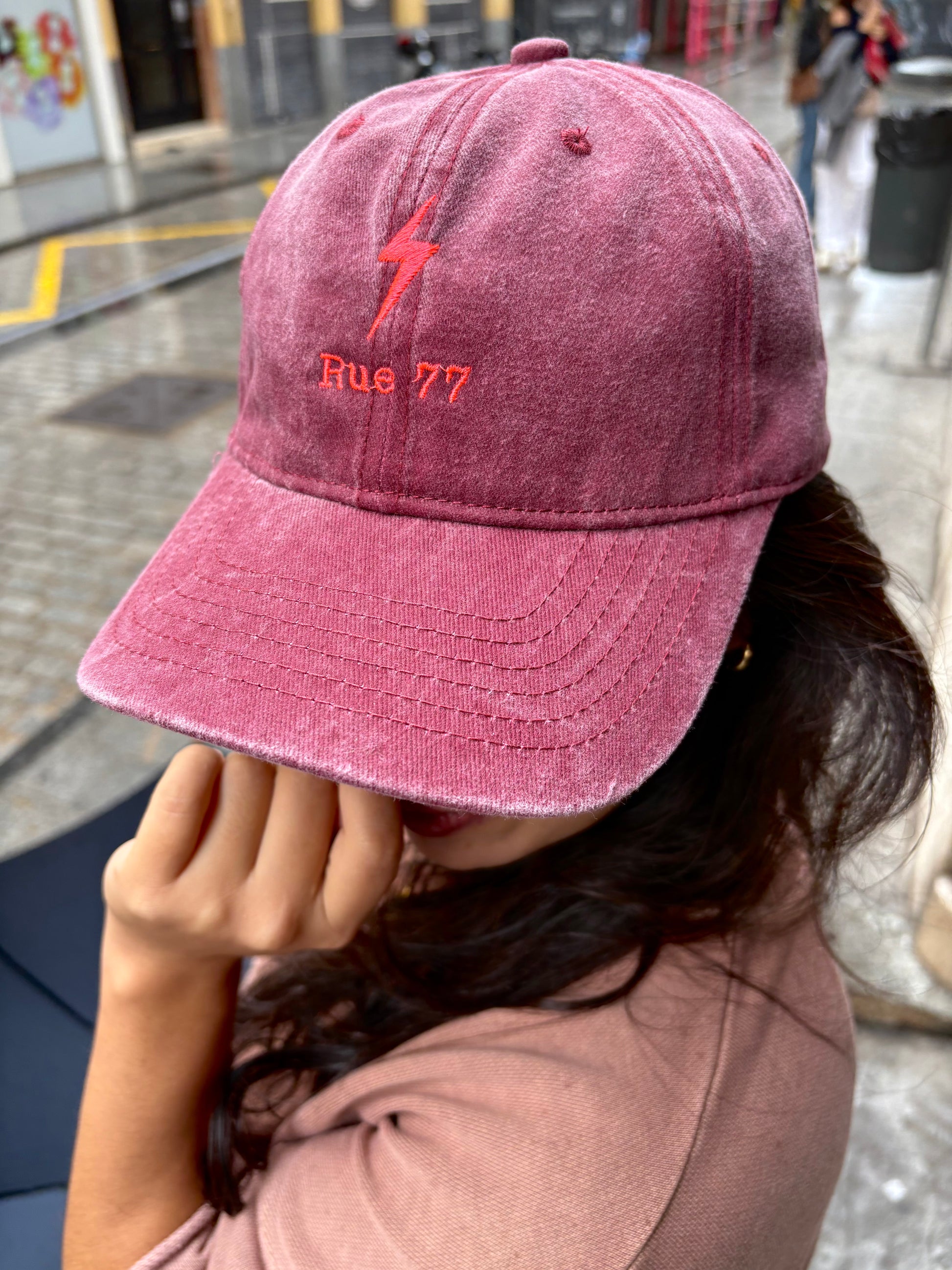 Gorra de algodón efecto lavado con el logo del rayo Rue 77 bordado. Talla única. Se puede ajustar.