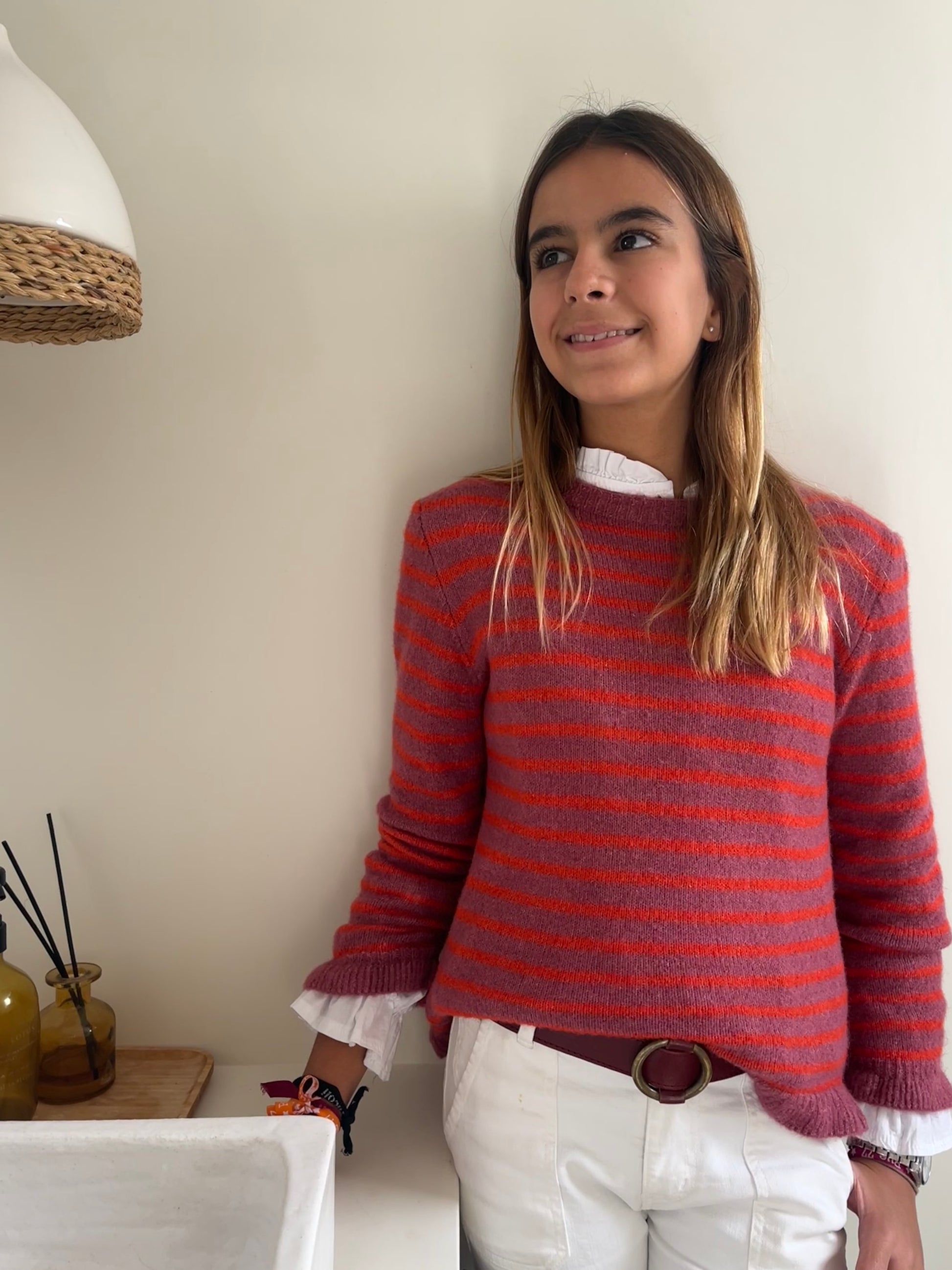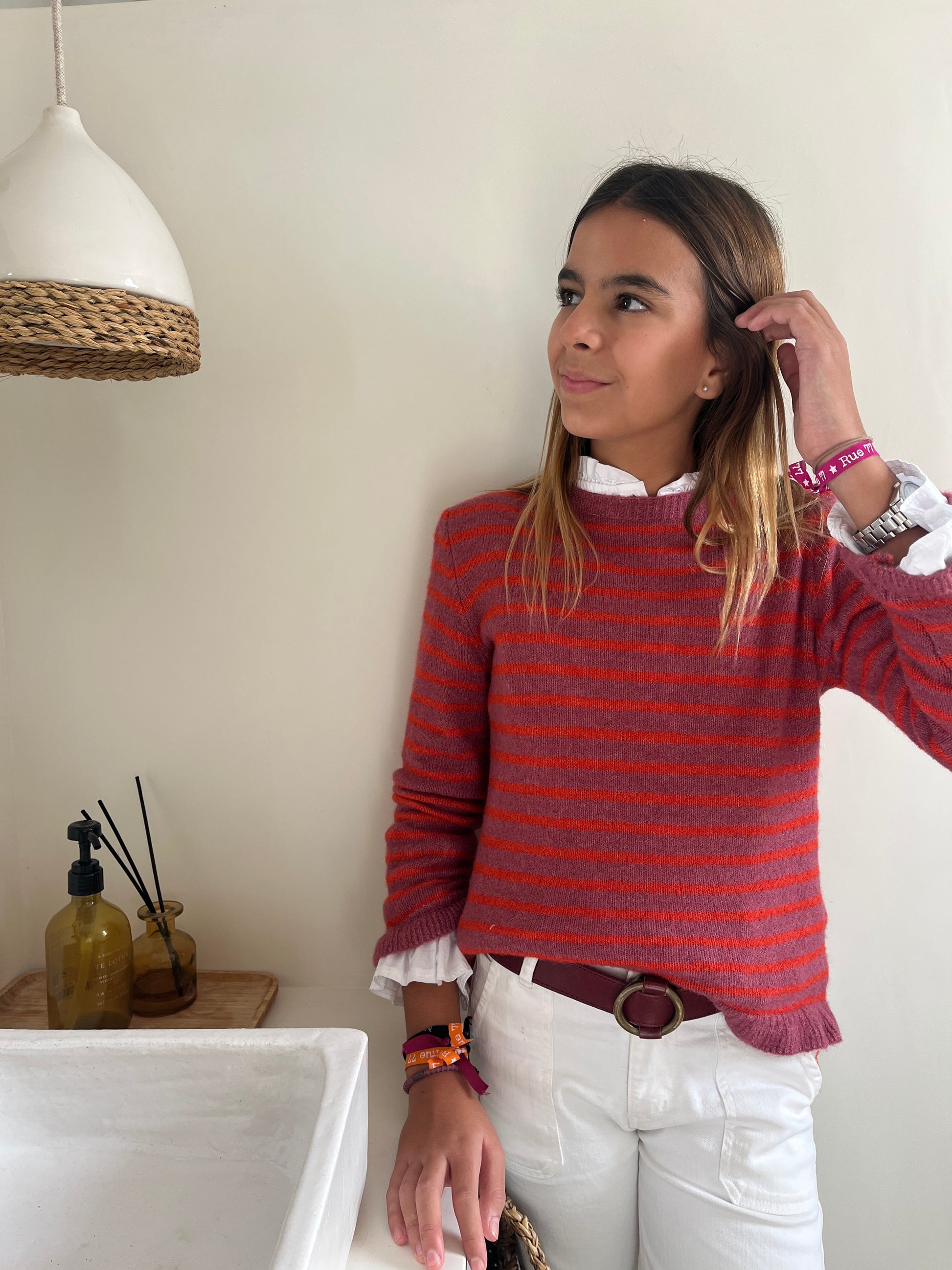 Suéter de lana en tono rosa con rayas anaranjadas. Los puños y la cintura están rematadas con un pequeño volante.