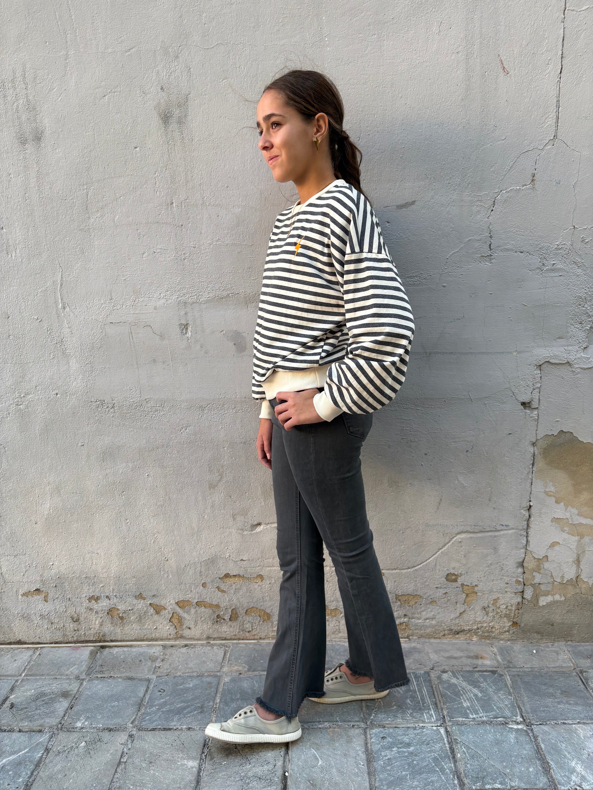 Sudadera rayas gris/blanco con rayo naranja flúor bordado