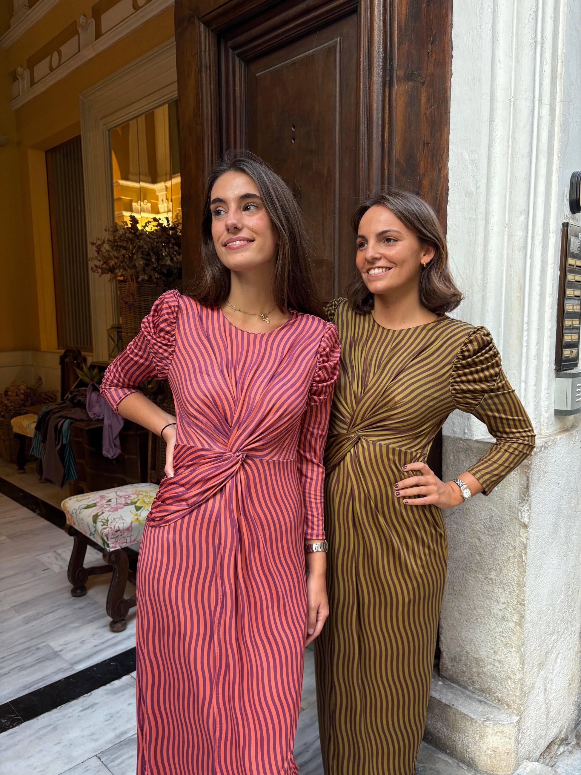 Vestido largo de licra con fruncido en la cintura y mangas abullonadas.